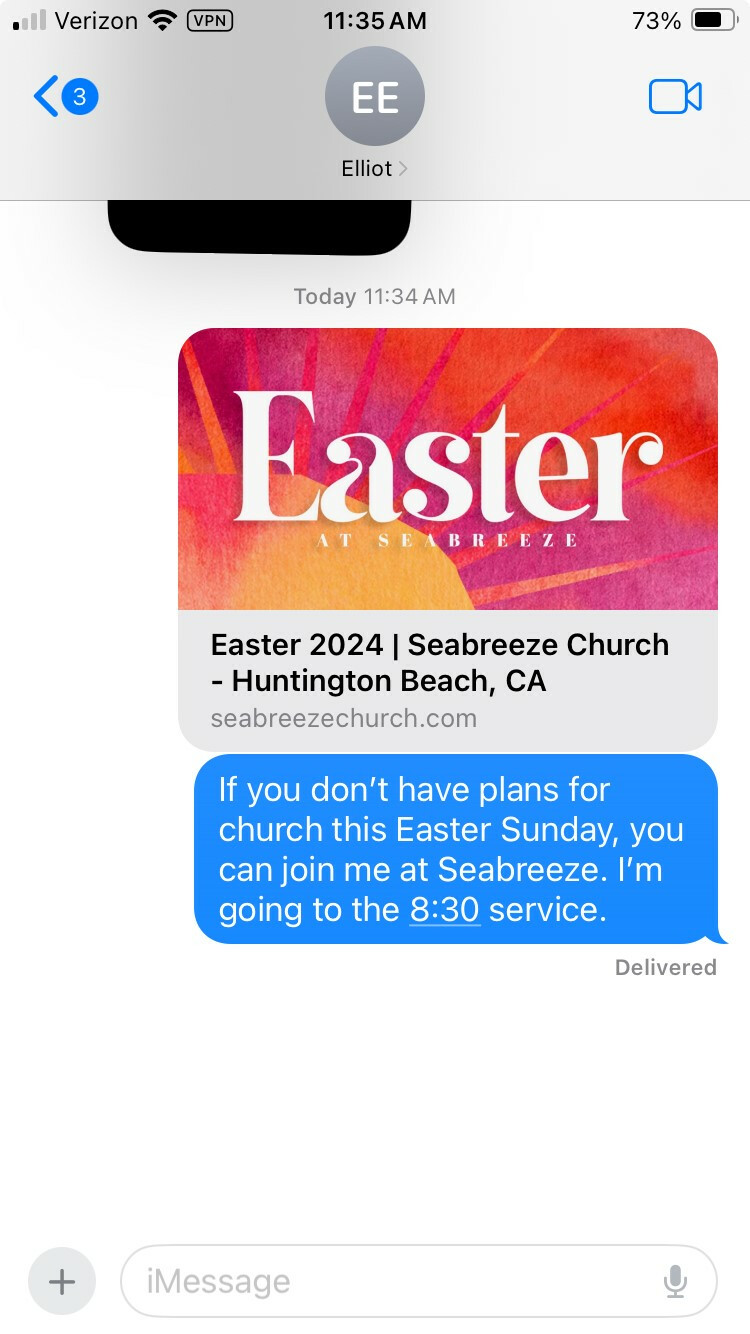 You can text a personal invite and include the link. Here is the link: https://www.seabreezechurch.com/easter-2024/. This is what it would look like in a text…